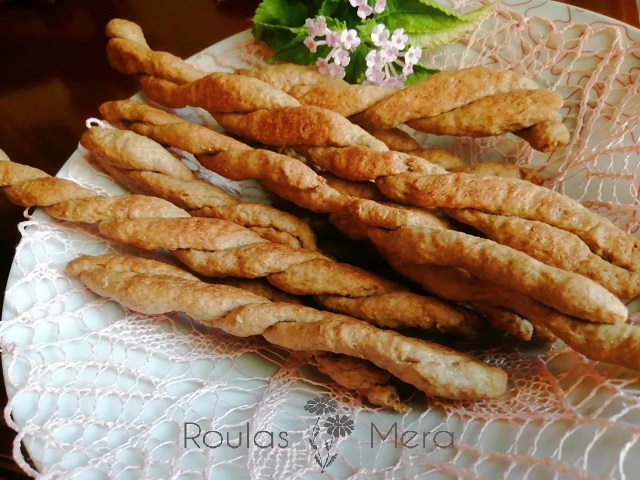 - Κόβουμε μικρά μπαλάκια και πλάθουμε λεπτά κορδόνια. Τα ενώνουμε δύο – δύο, κάνουμε στριφτάρια και τα αραδιάζουμε με σειρά στο ταψί ή στη λαμαρίνα του φούρνου, στρωμένη με χαρτί ψησίματος. Φροντίζουμε να υπάρχει λίγη απόσταση μεταξύ τους, γιατί με το ψήσιμο θα φουσκώσουν. Ψήνουμε σε προθερμασμένο φούρνο στους 180 – 190 βαθμούς C για 20 λεπτά περίπου, μέχρι να ροδίσουν.