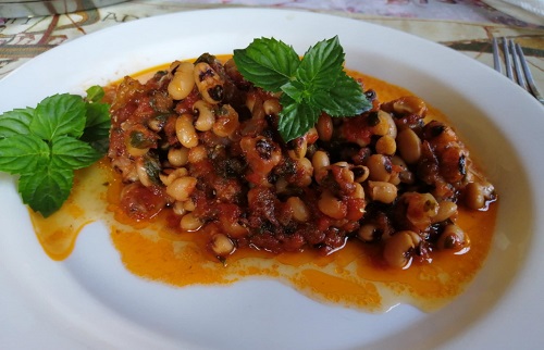 - Καθαρίζουμε τα μαυρομάτικα φασόλια, τα πλένουμε, τα βάζουμε στον ταβά με αρκετό κρύο νερό, τα βράζουμε για 5 λεπτά και τα σουρώνουμε.