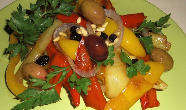 Ψήνουμε τις πιπεριές ολόκληρες και τα κρεμμύδια καθαρισμένα και κομμένα σε ροδέλες. Αφού κρυώσουν οι πιπεριές τις ξεφλουδίζουμε, αφαιρούμε σπόρους και μεμβράνες και τις κόβουμε σε μακρόστενες λωρίδες. Τις τοποθετούμε σε πιατέλα και από πάνω τα κρεμμύδια, τα μύρτιλα ή τις σταφίδες και τα κουκουνάρια ή αμύγδαλα. Χτυπάμε το λάδι με το μπαλσάμικο και το αλάτι στο σέϊκερ και ρίχνουμε το μείγμα στη σαλάτα. Τέλος στολίζουμε με βασιλικό ή μαϊντανό και τις ελιές. Έτοιμη να την απολαύσουμε…